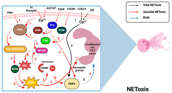 NETosis in neutrophils. (Suicidal NETosis). Step 1: Activation of PKC-α: Various agents such as PMA directly stimulate PKC-α. Additionally, increased intracellular Ca2⁺ due to antibodies and the calcium ionophore A23187 elevate intracellular calcium levels, subsequently activating PKC-α. FGFR activation triggers PLC-γ, producing DAG to enhance PKC-α activity. Step 2: Cascade of Biochemical Reactions: PKC-α initiates the RAF kinase/threonine protein kinase/mitogen-activated protein kinase/extracellular signal-regulated kinase (RAF/MEK/ERK) signaling pathway, which then stimulates NOX, leading to ROS production. Step 3: ROS-Mediated Dissociation and Granule Release: Elevated ROS levels cause the oxidative dissociation of Trx from TXNIP, releasing Trx. Furthermore, ROS facilitates the release of azurophilic granules containing MPO, elastase, and cathepsin, which are crucial for the nuclear processes involved in suicidal NETosis. Step 4: Activation of PAD4: Increased intracellular calcium, due to the calcium ionophore A23187 and antibodies, can directly activate PAD4. Furthermore, freed Trx offers an alternative activation route for PAD4, distinctively without utilizing its oxidoreductive function. Step 5: Inflammatory Signaling Loop: CXCR activation by IL-8 initiates the PI3K/PKB pathway, promoting downstream signaling that activates NF-κB. NF-κB activation, stimulated by the PI3K/PKB pathway and TXNIP after dissociation from TRX, enhances iNOS production. This is essential for NO generation, which exacerbates inflammation and reinforces the suicidal NETosis feedback loop. Step 6: Histone Citrullination and NET Formation: PAD4 converts arginine to citrulline in histones, leading to histone citrullination and promoting NET formation, essential for both types of NETosis. (Vital NETosis). Step 1: Bacterial Induction and Calcium Elevation Pathway: Bacteria like E. coli and S. aureus, or bacterial-specific molecular patterns recognized by PRRs, induce vital NETosis. Activation of receptors such as TLR-2, TLR-4, and CR raises intracellular Ca2⁺ levels, facilitating PAD4 activation. Step 2: Activation of PAD4 and Histone Modification: similar to suicidal NETosis, elevated Ca2⁺ levels activate PAD4, which then mediates histone citrullination. Step 3: Histone Decondensation and NET Release: histone citrullination causes decondensation, and in vital NETosis, NETs are released from vesicles without causing membrane rupture or neutrophil death. (NETosis: neutrophil extracellular trap formation; PKC-α: protein kinase C alpha; PMA: phorbol myristate acetate; FGFR: fibroblast growth factor receptor; PLC-γ: phospholipase C-gamma; DAG: diacylglycerol; RAF/MEK/ERK—RAF kinase/mitogen-activated protein kinase/extracellular signal-regulated kinase signaling pathway; NOX: NADPH oxidase; ROS: reactive oxygen species; Trx: thioredoxin; TXNIP: thioredoxin interacting protein; MPO: myeloperoxidase; PAD-4: peptidylarginine deiminase 4; CXCR: C-X-C motif chemokine receptor; IL-8: interleukin 8; PI3K/PKB: phosphoinositide 3-kinases/protein kinase B signaling pathway; NF-κB: nuclear factor kappa-light-chain-enhancer of activated B cells; iNOS: inducible nitric oxide synthase; NO: nitric oxide; PRRs: pattern recognition receptors; TLR-2, TLR-4: toll-like receptor 2, toll-like receptor 4; CR: complement receptor).