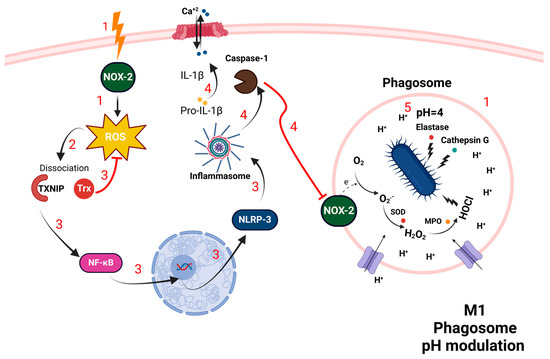 Redox regulation is crucial for the functionality of M1 macrophages. ROS produced by NOX-2 are key elements that maintain inflammation, enable phagocytosis, and facilitate cytotoxic actions for pathogen elimination, while also supporting crucial autophagy processes. Notably, while NOX-2-derived ROS are essential for inducing autophagy, mutations that impair superoxide formation can lead to hyperinflammation and recurrent infections [54,55,56]. The TXNIP/NF-κB/NLRP-3 inflammasome-caspase-1 pathway plays a crucial role in regulating phagosomal pH and bacterial clearance in macrophages (Figure 4). Upon bacterial engulfment, NOX-2 generates ROS. This triggers the dissociation of Trx from TXNIP, subsequently activating NF-κB along with NLRP-3. Caspase-1 is then activated, serving a dual purpose by processing cytokines and regulating ROS levels. This dual function contributes to the maintenance of an acidic phagosomal environment (pH 4) during the late stage of phagosome maturation by inhibiting NADPH oxidase activity. This controlled acidity enhances the activity of acidic enzymes, promoting bacterial degradation and effective immune responses [17,24,29,57].