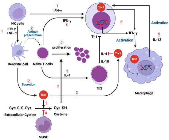 Trx1 role in proliferation and differentiation of T cells. Step 1: NK Cells’ Role: NK cells influence the maturation of dendritic cells by releasing TNF-α and IFN-γ. Not only does IFN-γ mature DCs, but it also significantly drives the differentiation of Th1 cells. Step 2: DCs’ Role: Mature dendritic cells capture antigens and present them to naive T cells. This antigen presentation is crucial for the initial activation of the naive T cells, setting the stage for the adaptive immune response. The protein Trx1, secreted by dendritic cells, regulates the expression of CD4 and CD30 receptors on T cells. Trx1 not only adjusts receptor expression but also facilitates the conversion of cystine to cysteine, crucial for T-cell proliferation. Trx-1 deactivates IL-4, suppressing the Th2 immune response and favoring Th1. Step 3: Influence of Cytokines on Differentiation: Naive T cells differentiate into various helper T-cell subsets under the influence of local cytokines. IL-4 drives the differentiation into Th2 cells, while IFN-γ promotes the development of Th1 cells. Step 4: MDSCs’ Role: MDSCs limit cystine availability by competing for this molecule, which is essential for its conversion by antigen-presenting cells. This competition impairs T-cell function and promotes immune suppression by interacting with Trx1. Step 5: Feedback Loop between Th1 Cells and Macrophages Involving Trx-1 and IFN-γ: Trx1 enhances IFN-γ production in Th1 cells, which in turn promotes higher levels of Trx1. This feedback loop also involves IFN-γ-activated Trx1 in macrophages, which boosts IL-12 secretion by modulating the thiol redox state. (Trx1: thioredoxin 1; NK cells: natural killer cells; TNF-α: tumor necrosis factor alpha; IFN-γ: interferon gamma; DCs: dendritic cells; T cells: T lymphocytes; CD4: cluster of differentiation 4; CD30: cluster of differentiation 30; IL-4: interleukin 4; Th1: T helper type 1 cells; Th2: T helper type 2 cells; MDSCs: myeloid-derived suppressor cells; IL-12: interleukin 12).