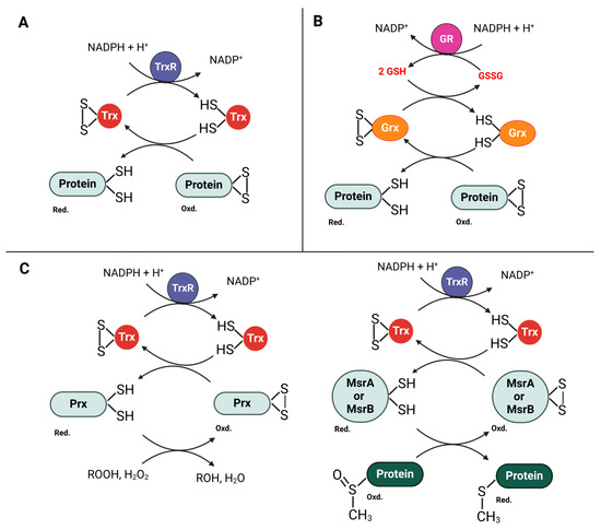 In parallel with the Trx system, Grxs also play a crucial role in reducing oxidized cysteine residues in proteins. The interaction between the Trx and Grx systems is particularly notable in Escherichia coli, a well-studied Gram-negative model organism. E. coli has two types of thioredoxins, Trx-1 and Trx-2, with Trx-1 being integral to reducing disulfide bonds in enzymes vital for cellular processes. Remarkably, E. coli can withstand oxidative stress even without Trx-1 and Trx-2, due to the compensatory activity of its Grx systems [114,115,116,117,118]. Mutants of E. coli lacking Trx-1 and Trx-2 can endure oxidative stress through the action of Grxs, which are structurally similar to Trxs and vital for redox processes in cells. Grxs are differentiated by their catalytic motifs: dithiol Grxs (like Grx1, Grx2, and Grx3) and the monothiol Grx4. Dithiol Grxs interact with and become oxidized by oxidized proteins but are restored via a two-step reaction with glutathione (GSH), producing reduced Grx and oxidized glutathione (GSSG) (Figure 7B). This GSSG is subsequently converted back to GSH by glutathione reductase, an NADPH-dependent enzyme, which completes a vital cycle of reduction and regeneration, helping maintain cellular function under oxidative stress [113,114,119]. While monothiol Grxs utilize a single cysteine residue in their active site to interact with protein disulfides, this interaction leads to the formation of a mixed disulfide bond between the cysteine of the Grx and the GSH attached to the target protein, effectively glutathionylating the protein. Subsequently, this glutathionylated intermediate is resolved by another GSH molecule, which reduces the mixed disulfide and regenerates the reduced form of the protein. Meanwhile, the Grx is returned to its reduced state, ready for another cycle. This process facilitates the reversible regulation of protein functions through modifications in their thiol groups, enhancing cellular adaptability to oxidative stress [119,120].