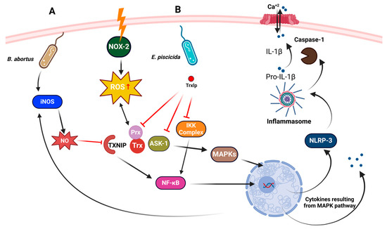 Mechanisms of immune suppression during bacterial infection. (A) Infection with B. abortus causes the expression of iNOS and production of NO, which suppress the expression of TXNIP within infected macrophages. Since TXNIP is crucial for activating NF-κB, its suppression leads to decreased activity of this critical transcription factor. With NF-κB activity diminished, the production of NO and ROS, both vital for immune defense, is also reduced. (B) Edwardsiella piscicida secretes Trxlp, a protein that mimics the structure of human hTrx1 but is devoid of redox activity. Trxlp binds directly to the IKK complex, which is essential for the activation of the NF-κB signaling pathway. This pathway is pivotal for initiating immune responses such as inflammation and apoptosis. The direct engagement of Trxlp with IKK obstructs the nuclear translocation of NF-κB. Without NF-κB in the nucleus, the transcription of immune response genes is hindered, which in turn reduces inflammation and apoptosis. Trxlp also interacts with Prx enzymes that normally reduce H2O2. This interaction instead leads to a localized accumulation of H2O2. The increase in H2O2, facilitated by Trxlp’s interaction with Prx, suppresses apoptosis signal-regulating kinase 1 (ASK1). ASK1 is involved in activating MAP kinases, key players in stress response pathways including those governing inflammation and cell death. Suppressing ASK1 leads to reduction in the activation of MAP kinases and the production of pro-inflammatory cytokines. This results in a weakened immune response, creating a more favorable environment for bacterial survival. (TXNIP: thioredoxin-interacting protein; NF-κB: nuclear factor kappa-light-chain-enhancer of activated B cells; NO: nitric oxide; ROS: reactive oxygen species; Trxlp: thioredoxin-like protein; hTrx1: human thioredoxin 1; IKK: IκB kinase inhibitor of kappa B; Prx: peroxiredoxin; H2O2: hydrogen peroxide; ASK1: apoptosis signal-regulating kinase 1; MAPKs: mitogen-activated protein kinases).