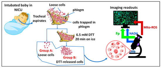 We used the mouse AM cell line to confirm the absence of a DTT treatment-associated effect and support our conclusion that there were no systematic shifts in the imaging indices between group A and group B cells from infant TA samples. DTT is commonly used to release mucus-trapped cells [49,50]. It acts by conferring protection to thiol groups and reducing disulfide bonds to sulfhydryl groups in peptides and proteins. There are no available data on whether DTT affects the mitochondrial redox state. Accordingly, we treated cultured AM cell lines with DTT from 1 to 6.5 mM in the same fashion as we did for the TA samples to examine the potential effect of DTT on mitochondrial redox state over a range of plausible use concentrations. Doing so did not produce any significant effects on Fp, NADH, the redox ratio, or the mitochondrial ROS nor any trend in redox changes (Figure 14). Therefore, it is likely that the differences in the imaging indices shown in Figure 13 represent authentic cellular differences and not DTT effects.