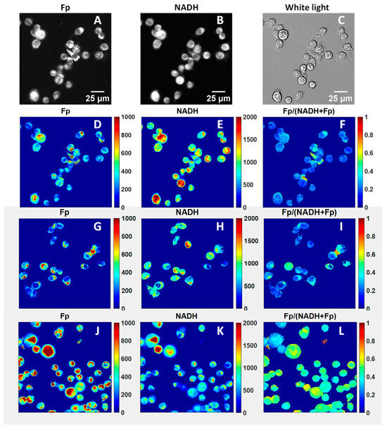 Representative images of mouse alveolar macrophages. Images (A–C) are raw images of AM under normal conditions. (D) and (E) are processed redox images corresponding to raw images (A) and (B), respectively. (F) is the corresponding redox ratio image. Images (G–I) and (J–L) are typical processed redox images of AM under 0.45 and 0.9 mM H2O2, respectively. The color bars indicate the pixel intensities or redox ratio (0–1) with red being more intense, i.e., the pixel being either higher NADH level or higher Fp level, or higher redox ratio, and blue less intense, i.e., the pixel being either lower NADH level, or lower Fp level, or lower redox ratio.