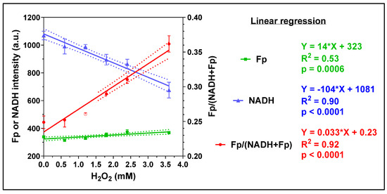 The immediate redox responses to acute exogenous H2O2 challenge at increasing concentrations, where the intensities of Fp and NADH are shown on the left y-axis and the redox ratio on the right y-axis. (mean ± SD, N = 3 dishes). Regression equation, goodness of fit (R2), and p-value corresponding to the regression slope are shown.