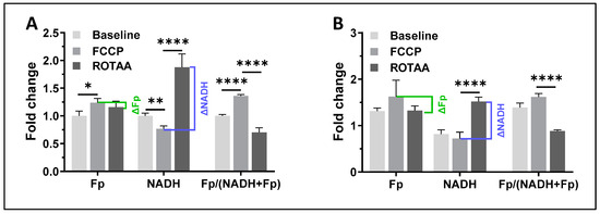 Since ROS-induced DNA damage is known to exhaust intracellular NAD+ due to the activation of NAD+-dependent DNA repair mechanisms [43,44,45,46] and here we observed an immediate decrease in NADH after each addition of H2O2, we suspected that ROS will also diminish the availability of NADH. This can be confirmed by observing a reduced dynamic range of NADH. To evaluate the NADH dynamic range, we modulated cellular metabolic states and imaged the redox responses [33,47,48]. We first applied FCCP to AM culture to uncouple mitochondrial oxidative phosphorylation, then added the mitochondrial inhibitors rotenone (ROT) plus antimycin A (AA), which inhibits complex I and III, respectively. Under complete uncoupling with FCCP, all NADH turns into NAD+ and a lower NADH signal is expected, which is the oxidized extreme. Conversely, under ROT and AA treatment, there is a buildup of NADH and an increased NADH signal is expected, which is the reduced extreme. The remaining signals are likely autofluorescence of other molecules. By calculating the difference in NADH between the two redox extremes, we obtained the dynamic ranges of NADH and Fp, denoted as ΔNADH and ΔFp, respectively. As anticipated, when the cells were challenged with 0.9 mM H2O2, we found a significantly lower ΔNADH (~28% decrease) and a significantly higher ΔFp (~276% increase) (Figure 4A,B). Significant decrease in ΔNADH and an increase in ΔFp were also observed after AM was treated with 0.45 mM H2O2, although with a less pronounced magnitude of change.