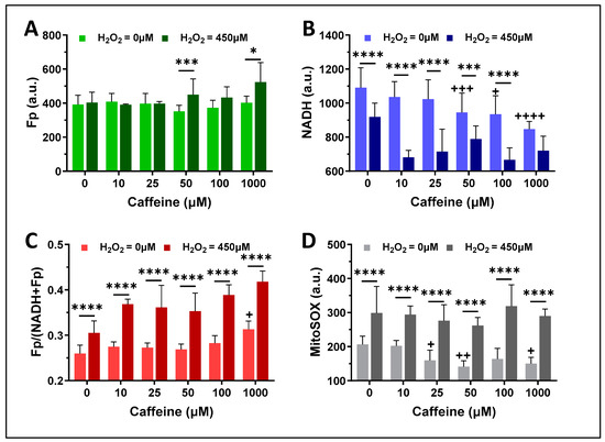 The redox effects of caffeine treatment alone (16 h, the bars with lighter colors) and the redox effects of H2O2 (450 µM, 30 min) on the AM pre-treated with caffeine at various doses for 16 h (the bars with darker colors). (A) The effects on Fp; (B) the effects on NADH; (C) The effects on the mitochondrial redox ratio; (D) The effects on the mitochondrial ROS. Bars: mean ± SD (N = 4 dishes), * or +, p < 0.05, ++, p < 0.01, *** or +++, p < 0.001, **** or ++++, p < 0.0001, where + or ++, or ++or+++ or ++++ indicates the statistical comparisons against the control (no caffeine pretreatment or exposure to H2O2).