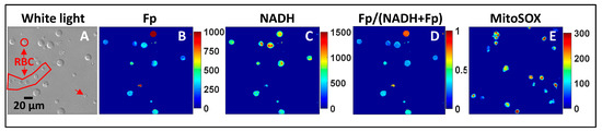 Typical white light and pseudo-colored redox and ROS images of a TA sample. (A) Shows the white light image of macrophages and a small number of red blood cells (RBCs) as indicated; (B–D) are the corresponding redox images with the color bars indicating their intensities or redox ratio (0–1). The RBCs do not have either Fp or NADH signals due to a lack of mitochondria; (E) is a typical mitochondrial ROS image (different FOV from that of the redox images).