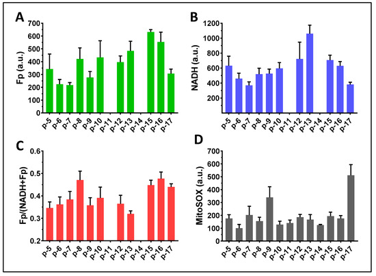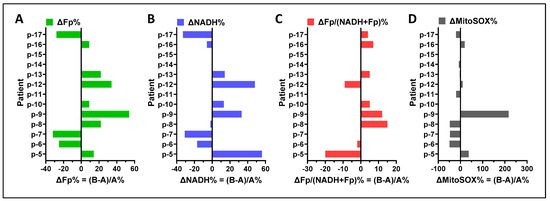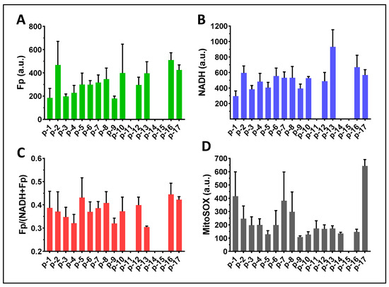 A comparison of results obtained from group A and group B cells using paired t-tests did not detect a significant difference in any of the specific imaging readouts, respectively, between cells from group A and group B. To examine the potential influence of cell preparation methods on the study results, we compared the imaging indices between group A and group B within individual subjects and found a range of positive and negative differences (Figure 13A–D). Across the study cohort, the largest individual patient differences were ~+55% in Fp and NADH readouts (in different patients), ~−20% in the redox ratio, and ~+200% in the mitochondrial ROS. The highest Fp difference corresponded to the highest ROS difference (p-9). Two out of ten cases had their Fp higher but NADH lower in group B (p-8 and p-16), but their NADH differences were negligible. The redox ratio differences for both p-6 and p-7 were also negligible and 25% of the mitochondrial ROS differences were trivial (p-10 and p-13). In summary, there does not appear to be a systematic pattern in the redox differences, indicating that the individual sample differences between the two groups of cells were unlikely due to cell preparation methods.