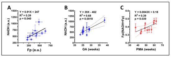 Correlations between the redox indices of group B and clinical parameters. (A) A significant positive correlation between Fp and NADH; (B) A significant positive correlation between the NADH level and subject gestational age; (C) A significant positive correlation between the redox ratio and the postmenstrual age (PMA) at sample collection. Regression equation, goodness of fit (R2), and p-value corresponding to the regression slope are shown.