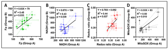 Significant positive correlations of the imaging indices between group A and group B. (A) Correlation of Fp; (B) Correlation of NADH; (C) Correlation of the redox ratio; (D) Correlation of the mitochondrial ROS. The error bars in (A–D) are standard deviations of the FOVs for any specific TA sample. All the intensity parameters (Fp, NADH, MitoSOX) are in a.u. Regression equation, goodness of fit (R2), and p-value corresponding to the regression slope are shown.