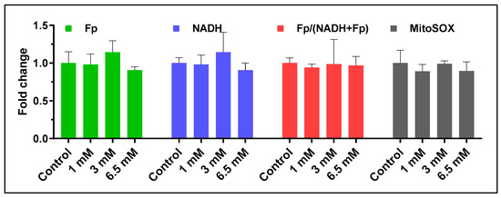 The imaging and data processing details have been reported in our previous works [33,35,36,41]. Briefly, ORI was carried out with an inverted wide-field Zeiss fluorescence microscope equipped with a temperature chamber set at 37 °C (Axio Observer 7, ZEISS, Oberkochen, Germany) with a Plan-Apochromat 20×/0.8 M27 lens. The image resolution and size were 0.293 µm × 0.293 µm2/pixel and 562.56 µm × 356.29 µm/field of view (FOV), respectively. The intrinsic fluorescence of NADH and Fp were first imaged using the following filter sets: for NADH, excitation (Ex) 370–400 nm, emission (Em) 414–450 nm; for Fp, Ex 450–488 nm, Em 500–530 nm. After ORI, the dishes were administered with MitoSOXTM Red with a final concentration of 2 µM for imaging mitochondrial superoxide in the live cells. The dishes were incubated at 37 °C for 10 min, followed by 2 rinses with PBS, then imaged with Ex 370–400 nm and Em 580–610 nm setting. For lipid peroxidation detection, the Cell-based Lipid Peroxidation Assay Kit (Abcam, Fremont, CA, USA, Cat. # ab243377) was used per the manufacturer’s instructions, where the green fluorescence was imaged with Ex 450–488 nm, Em 500–530 nm, and the red fluorescence was imaged with Ex 577–604 nm and Em 619–675 nm. The green and red fluorescence intensities were quantified, and their ratio was then calculated to obtain the lipid peroxidation index. To image mitochondrial dynamic network structure, MitoViewTM green (Biotium, Fremont, CA, USA) was used to stain mitochondria according to the manufacturer’s manual and imaged with a STELLARIS confocal microscope (Leica Microsystems, Inc., Deerfield, IL, USA)