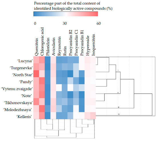 The first cluster grouped the leaf samples of ‘Lucyna’, ‘Turgenevka’, ‘North Star’, ‘Pandy’, and ‘Vytenu zvaigzde’. In the leaf samples of these cultivars, the content of their identified biologically active compounds was close to the mean values. The leaf samples of ‘Note’ and ‘Tikhonovskaya’ formed the second cluster. The samples forming this cluster were characterized by high contents of quercitrin, avicularin, reynoutrin, and rutin and low contents of procyanidin B1 and procyanidin B2. The leaves of ‘Molodezhnaya’ and ‘Kelleris’ formed the third and fourth clusters, respectively. Leaves of the ‘Molodezhnaya’ cultivar differed from the others in having high contents of chlorogenic acid, avicularin, reynoutrin, phloridzin, and procyanidin C1 and low contents of quercitrin, hyperozide, isoquercitrin, procyanidin B1, and procyanidin B2, while the leaves of ‘Kelleris’ were characterized by high contents of chlorogenic acid, hyperozide, isoquercitrin, procyanidin B1, procyanidin B2, and procyanidin C1 as well as low contents of quercitrin and avicularin.