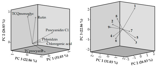 PCA loading plots and score plots of different cherry leaf samples. PC—principal component; TCQmonoglyc—the total content of quercetin monoglycosides; TCprocyanB—the total content of identified B type proanthocyanidines. 1—‘Kelleris’; 2—‘Lucyna’; 3—‘Molodezhnaya’; 4—‘North Star’; 5—‘Note’; 6—‘Pandy’; 7—‘Tikhonovskaya’; 8—‘Turgenevka’; 9—‘Vytenu zvaigzde’.