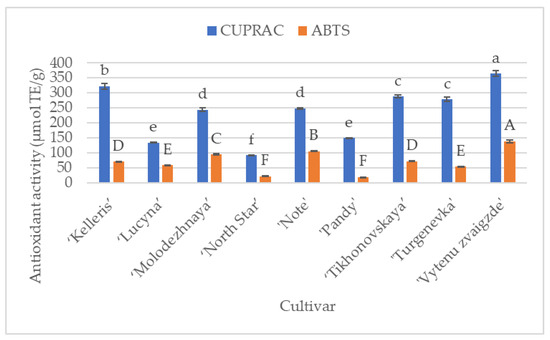 Plant extracts are multicomponent matrices whose antioxidant activity occurs through several different reaction mechanisms [71,72]. For this reason, it is recommended that at least two methodologies with different mechanisms be applied to studies of plant extracts [73]. The ABTS radical–cation binding methodology was applied to evaluate the antiradical activity of sample extracts of cherry leaves in vitro, and their reducing activity in vitro was determined by applying the CUPRAC methodology.