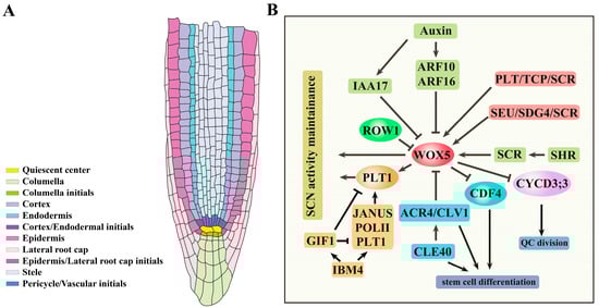 Key signaling in the regulation of the root apical meristem. (A). The structure of the root apical meristem (RAM). The quiescent center (QC) and its surrounding stem cells together form a stem cell niche (SCN). Different stem cells (also called initials) produce a variety of cell types in roots. (B). The key signals for controlling SCN maintenance. WOX5 is a critical factor for the regulation of SCN maintenance. Auxin represses WOX5 expression by ARF10, ARF16, and IAA17. ROW1 and the module CLE40/ACR4/CLV1 can also inhibit WOX5 expression. The modules SHR/SCR, PLT/TCP/SCR, and SEU/SDG4/SCR promote WOX5 expression. In addition, WOX5 promotes PLT1 expression to control SCN activity. GIF1 and JANUS are antagonistic to regulate PLT1 expression (B).