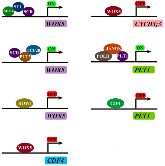 The homeodomain transcription factor gene WOX5 is specially expressed in the QC to control the CSC identity (Table 1). Loss of function of WOX5 causes differentiation in CSCs, while increased WOX5 expression inhibits the differentiation of CSCs and causes CSC over-proliferation [26]. WOX5 inhibits QC division by repressing the expression of the D-type cyclin genes CYCD3;3 and CYCD1;1. In particular, the WOX5 protein can directly interact with the promoter of CYCD3;3 [27]. It is necessary that WOX5 suppresses CSC differentiation and maintains CSC identity. Another study indicated that the WOX5 protein moves from the QC into CSCs, where it directly represses the transcription factor gene CYCLING DOF FACTOR 4 (CDF4). WOX5 recruits TPL/TPR co-repressors and the histone deacetylase HDA19 to the CDF4 gene promoter and regulates CDF4 expression. CDF4 antagonizes WOX5 activity and promotes columella cell differentiation. WOX5 functions as a mobile signal from the QC to the CSC to maintain CSC identity by the modulation of CDF4 (Figure 1B and Figure 2) [28]. Differentiated columella cells and CSCs provide the secretion peptide CLAVATA3/ESR-RELATED40 (CLE40) as a feedback signal to control WOX5 expression by the receptor kinases ARABIDOPSIS CRINKLY4 (ACR4) and CLAVATA1 (CLV1) [29,30]. CLV1 can sense the signal of CLE40 by forming dimers or tetramers with ACR4 and negatively regulate the expression of WOX5 to maintain the activity of CSCs (Figure 1B and Table 1) [30,31]. The PHD domain-containing protein REPRESSOR OF WUSCHEL1 (ROW1) directly represses WOX5 expression by histone modification [32]. These findings indicate that multiple players are involved in the regulation of the core factor WOX5 to maintain RAM activity (Figure 1B and Figure 2).