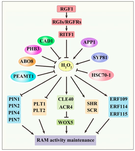 RAM maintenance is very important for root development and stress adaptation. H2O2 acts as a critical signal to help RAM maintenance. The homeostasis and signaling of H2O2 are crucial for stem cell specification and formative cell division. Many key players, such as PLTs, SCR, SHR, and PINs, are regulated by H2O2 in RAM development; however, the fine-tuned regulatory mechanisms of H2O2 controlling the core factors need to be studied in the future. It will be interesting to elucidate the redox regulation of proteins in H2O2-mediated RAM development.