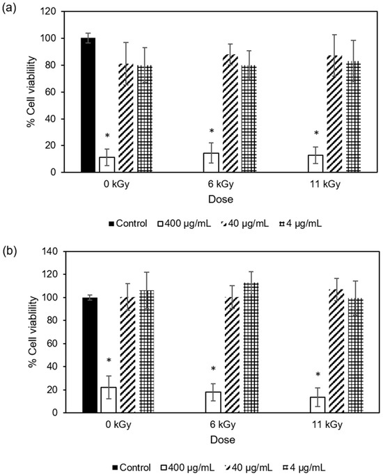 Cellular viability of (a) A549 and (b) Caco-2 cell lines in the presence of extracts from non-irradiated COP and COP irradiated at 6 kGy or 11 kGy at three different concentrations (400 μg/mL, 40 μg/mL, and 4 μg/mL). The control is used for comparison and does not contain any extract. Each bar graph represents the mean and 95% confidence interval from three separate experiments. For each cell line, bars with * indicate a statistically significant difference from control at p < 0.05.