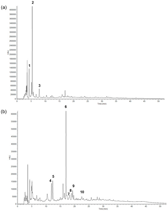 Chromatographic profile of the hydroethanolic extracts prepared from non-irradiated EOP samples, recorded at (a) 280 nm and (b) 370 nm.