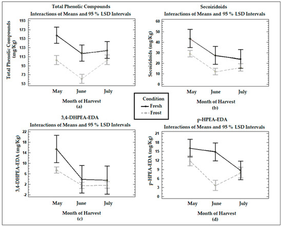 Graphs show the means and Fisher’s LSD multiple comparison intervals at 95% confidence of (a) total phenols, (b) secoiridoids, (c) 3,4−DHPEA−EDA (oleacein), and (d) p−HPEA−EDA (oleocanthal) in Arbequina VOOs from fresh (Fresh) and frozen olives (Frost).