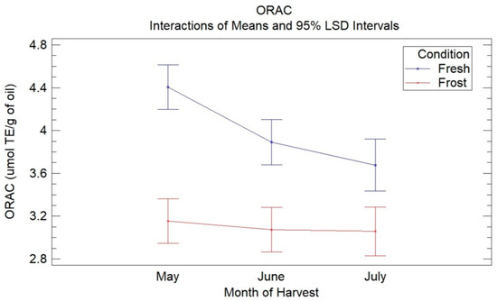 Graphic shows the means of treatments determined using Fisher’s LSD multiple comparison intervals at 95% confidence for ORAC assays in VOO from fresh and frozen olives during the three months of harvest.