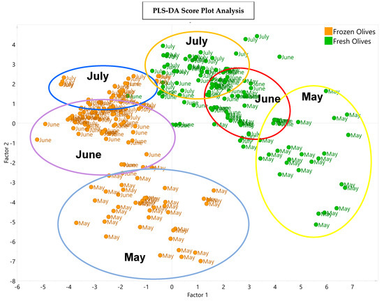 Figure 5 presents the PLS-DA depicting the distribution of the VOOs obtained from the fresh olives and the frozen olives in the three harvesting months. Factor 1 shows the variation in the samples due to the fresh and frost conditions being applied to the olives, and factor 2 shows the variation in the samples according to harvest month.