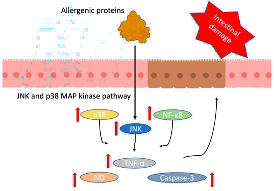 Pathway of soybean glycinin- and β-conglycinin-induced intestinal damage in animals. Glycinin (11S) and β-conglycinin (7S) increased mRNA and protein expression of jun N-terminal kinase (JNK), p38, and nuclear factor-kappa B (NF- κB). Soy antigens enhanced the level of nitric oxide (NO), tumor necrosis factor-α (TNF- α), and caspase-3, resulting in intestinal damage []. The red upward arrow represents the increase of the corresponding indicator.