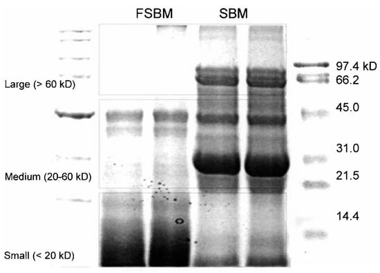 Fermentation is also an effective method to improve the nutritional values for SBM. It not only increases the crude protein content, the proportion of small peptides, free amino acids content, but also decreases degraded anti-nutritional factors, like oligosaccharides, trypsin inhibitors, glycinin and β-conglycinin []. Microbial fermentation of SBM is accomplished by utilizing either a fungal or bacterial strain. For fungi-based fermentation, the species of Aspergillus genus are used to ferment SBM [,,]. Fungi-based fermentation reduces TI [], phytate [], stachyose and raffinose [], and significantly increases small-sized peptides (Figure 3) []. In addition, it improves approximately 10% of the crude protein content compared to SBM, and most of the essential amino acids are also improved [,]. For bacteria-based fermentation, Bacillus spp. and Lactobacillus spp. are used to ferment SBM [,]. Much like fungi-based fermentation, it reduces TI, stachyose and raffinose [], and improves free amino acids and crude protein content [].