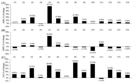 Effects of processed soy products replacing conventional soybean meal on growth performance of young animals. (A) represents the change of average daily gain (ADG); (B) represents the change of average daily feed intake (ADFI); (C) represents the change of gain to feed ratio (G:F). The selected studies (2000 to 2023) were (1) soy protein concentrate (SPC) replacing 100% soybean meal (SBM) in nursery diets [], (2) SPC replacing 100% SBM in nursery diets [], (3) SPC replacing 100% SBM in nursery diets [], (4) SPC replacing 100% SBM in nursery diets [], (5) enzyme-treated SBM (ESBM) replacing 97% SBM in nursery diets [], (6) ESBM replacing 50% SBM in phase 1 of nursery diets [], (7) ESBM replacing 33% SBM in phase 1 of nursery diets [], (8) ESBM replacing 100% full fat SBM in nursery diets [], (9) fermented SBM (FSBM) replacing 50% SBM in nursery diets [], (10) FSBM replacing 28% SBM in phase 1 of nursery diets [], (11) FSBM replacing 25% SBM in nursery diets [], (12) FSBM replacing 39% SBM in nursery diets [], (13) FSBM replacing 45% SBM in nursery diets [], and (14) FSBM replacing 50% in phase 1 of nursery diets [].