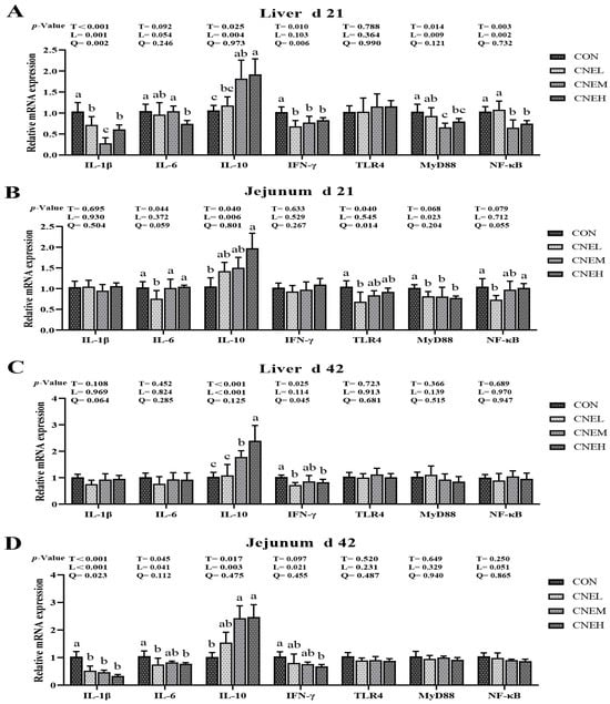 Effects of dietary C. nudiflora aqueous extract (CNE) supplementation on the immune-related gene expression of broilers at 21 and 42 days of age. (A–D) The expression levels of immune-related gene (IL-1β, IL-6, IL-10, IFN-γ, TLR4, MyD88, and NF-κB) in liver and jejunum on day 21 and 42, respectively. IL-1β, interleukin 1 beta; IL-6, interleukin 6; IL-10, interleukin 10; IFN-γ, interferon-gamma; TLR4, Toll-like receptor 4; MyD88, myeloid differentiation factor 88; NF-κB, nuclear factor kappa B. Treatments: CON, control group, basal diet; CNEL, the control diet + 300 mg/kg of CNE; CNEM, the control diet + 500 mg/kg of CNE; CNEH, the control diet + 700 mg/kg of CNE. Values are means ± SD (n = 6). T, treatment effect; L and Q, linear and quadratic effect of CNE doses. Means within a column with different superscripts are significantly different (p < 0.05).