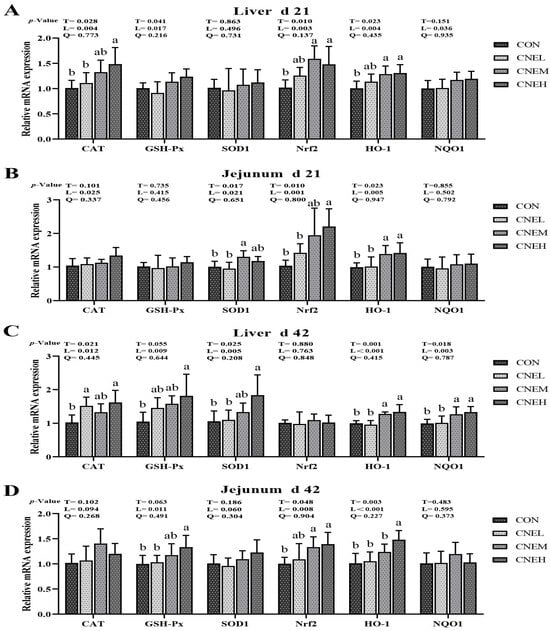 Effects of dietary C. nudiflora aqueous extract (CNE) supplementation on the antioxidant-related gene expression of broilers at 21 and 42 days of age. (A–D) the expression levels of antioxidant-related genes (CAT, GSH-Px, SOD1, Nrf2, HO-1, and NQO1) in liver and jejunum on days 21 and 42, respectively. CAT, catalase; GSH-Px, glutathione peroxidase; SOD1, copper and zinc superoxide dismutase; Nrf2, nuclear factor E2-related factor 2; HO-1, heme oxygenase-1; NQO1, NAD(P)H quinone oxidoreductase 1. Treatments: CON, control group, basal diet; CNEL, the control diet + 300 mg/kg of CNE; CNEM, the control diet + 500 mg/kg of CNE; CNEH, the control diet + 700 mg/kg of CNE. Values are means ± SD (n = 6). T, treatment effect; L and Q, linear and quadratic effect of CNE doses. Means within a column with different superscripts are significantly different (p < 0.05).