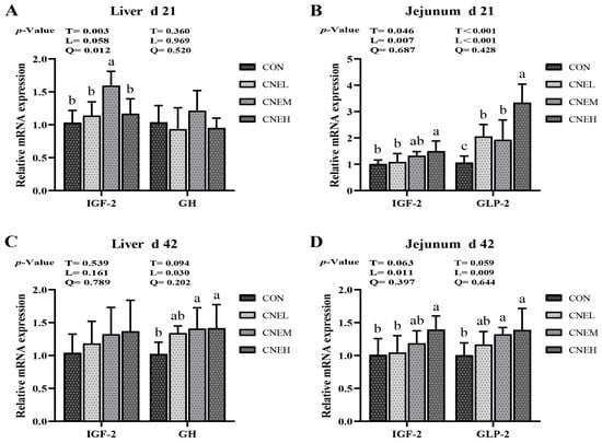 Effects of dietary C. nudiflora aqueous extract (CNE) supplementation on the growth-hormone-related factor gene expression of broilers at 21 and 42 days of age. (A–D) the expression levels of growth-related factor genes (IGF-2, GH, and GLP2) in liver and jejunum on days 21 and 42, respectively. IGF-2, insulin-like growth factor 2; GH, growth hormone; GLP2, glucagon-like peptide 2. Treatments: CON, control group, basal diet; CNEL, the control diet + 300 mg/kg of CNE; CNEM, the control diet + 500 mg/kg of CNE; CNEH, the control diet + 700 mg/kg of CNE. Values are means ± SD (n = 6). T, treatment effect; L and Q, linear and quadratic effect of CNE doses. Means within a column with different superscripts are significantly different (p < 0.05).