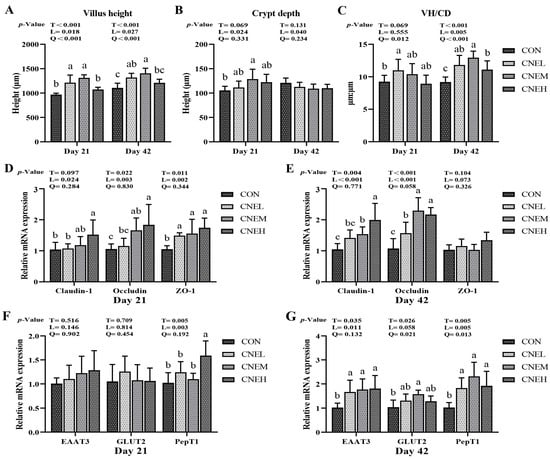The morphology of the jejunal villus of broilers from four groups was well preserved on days 21 and 42 (Figure S1). The jejunum in broilers showed an up-regulation of mRNA expression of crypt depth (linear, p < 0.05) on day 21, VH/CD (linear, p < 0.05) on day 21, VH/CD (linear, p < 0.01; quadratic, p < 0.01) on day 42, and villus height (linear, p < 0.05; quadratic, p < 0.01) on days 21 and 42 in response to rising levels of CNE in the diet. In the jejunum, the villus height in CNEL and CNEM groups was obviously higher than that of the CON group on days 21 and 42 (p < 0.05), while the crypt depth in CNEM group and the VH/CD in CNEL group were remarkably higher than that of the CON group on days 21 (p < 0.05). Next, we explored the expression of genes associated with tight junctions in the jejunal mucosa of broilers on days 21 and 42 (Figure 5D,E). The mRNA expression of jejunal Claudin-1 and Occludin showed significant increases (linear, p < 0.05) on days 21 and 42 with increasing CNE doses, while the jejunal ZO-1 expression also increased (linear, p < 0.01) on days 21. The CNEM and CNEH groups had higher expression of Occludin on day 21 (p < 0.05) and Claudin-1 on day 42 (p < 0.05) compared to the CON group. The CNEH group exhibited a significant increase in Claudin-1 expression on day 21 and ZO-1 expression on day 42 in contrast to the CON group. Furthermore, we examined the expression of genes involved in jejunal nutrient transport gene of broiler chickens on days 21 and 42 (Figure 5F,G). Increased dietary CNE supplementation resulted in up-regulation of mRNA expression levels of EAAT3 (linear, p < 0.05), GLUT2 (quadratic, p < 0.05), and PepT1 (linear, p < 0.01; quadratic, p < 0.05) at day 42, as well as jejunal PepT1 (linear, p < 0.01) at day 21. Compared to the CON group, the CNEH group obviously increased PepT1 expression on day 21 (p < 0.05), while CNEM group had a higher GLUT2 expression on day 42 (p < 0.05).