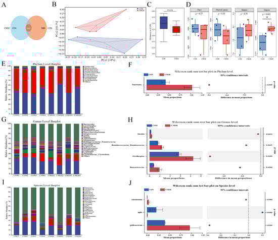 Dietary C. nudiflora aqueous extract at 700 mg/kg (CNEH) altered the composition and community diversity of the cecal microbiota at 42 day of age. (A) Venn diagram. (B,C) PCoA analysis and Anosim analysis based on Bray–Curtis distance. (D) Alpha-diversity. The bar plots of microbial composition and bacterial taxa show notable phylum-level differences (E,F), genus (G,H), and species (I,J) levels. Treatments: CON, control group, basal diet; CNEH, the control diet + 700 mg/kg of CNE. * indicates a significant difference at p < 0.05 (n = 4).