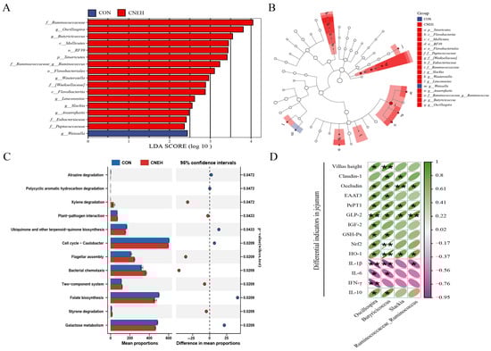 The impact of CNEH on gut microbiota was examined using 16S rRNA gene sequencing on fecal samples from the CON and CNEH groups. Following sequencing analysis, each sample yielded an average of 85,463 raw data, and after quality trimming and chimera checking, each sample yielded 56,855 high-quality sequences. The Venn analysis of operational taxonomic units (OTUs) in the cecal contents of 42 d-broilers (Figure 6A) revealed that the CON and CNEH groups contained 5069 and 4718 unique OTUs, respectively, and 1097 shared OTUs. Bray–Curtis distance-based PCoA of the microbial community revealed that the structure of cecal microbial community had changed between CON and CNEH groups, which formed two distinct clusters (Figure 6B,C). Regarding the α-diversity indices, broilers fed with CNEH had higher Simpson indices of cecal microflora than those in the CON group (Figure 6D). However, there was no significant statistical difference in Chao1, observed species, or Shannon indices between these two groups. Next, the analysis also included a comparison of the cecal bacterial compositions of the CON and CNEH groups. More than 90% of the total bacterial phylum in the CON and CNEH groups was represented by the two most prevalent bacterial phyla, Firmicutes and Bacteroidetes (Figure 6E). The findings of the differential analysis also demonstrated a significant increase in Tenericutes abundance by the CNEH group. (Figure 6F). At the genus level (Figure 6G), Bacteroides and Lactobacillus were the two most abundant genera in the cecal microbiota of broilers, followed by Barnesiella and Oscillospira. The relative abundances of Oscillospira, Ruminococcaceae_Ruminococcus, Butyricicoccus, and Slackia were increased (p < 0.05) in the broilers fed with CNEH (Figure 6H). At the species level (Figure 6I,J), an enhanced proportion of Butyricicoccus_pullicaecorum and Lactobacillus_coleohominis, and reduced Lactobacillus_agilis were observed in the CNEH group (p < 0.05). Moreover, we employed LEfSe to identify bacterial taxa that significantly differentiated between these two groups (Figure 7A,B), and the result revealed that 16 bacterial biomarkers were enriched (LDA threshold > 2.5) in the caecum of the CNEH group, including f_Ruminococcaceae (family), g_Oscillospira, and g_Butyricicoccus (LDA score > 3.5, p < 0.05).