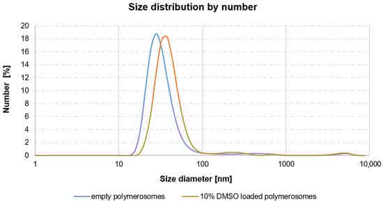 The hydrodynamic size of the polymerosomes was measured using the Dynamic Light Scattering (DLS) method and a Malvern Zetasizer Nano ZS Instrument with an automatic adjustment of attenuation and measurement time. The empty polymerosomes and 10% DMSO-loaded polymerosomes were thoroughly characterized and the results are presented in Figure 1. The loading of DMSO did not significantly affect the size and aggregation of the polymerosomes, nor did it destabilize them (Figure 1).