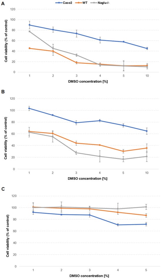 To examine the effect of DMSO (the concentrations range 1–10%) on the proliferation of human colorectal adenocarcinoma (Caco-2) cells and on the murine model of mucopolysaccharidosis, type IIIB, i.e., the WT (the control) and Naglu−/− (the line with mutation in gene encoding N-alpha-acetylglucosaminidase) cell lines, the cells were treated with DMSO using three different ways of administration: (1) directly to the medium culture supplemented with serum (Figure 2A); (2) into the serum-free culture medium (Figure 2B); and (3) in DMSO-loaded polymerosomes administrated directly into the serum-free culture medium (Figure 2C). After 24 h, the cells were subjected to the crystal violet assay. The results obtained revealed a concentration-dependent effect of DMSO administrated directly to the culture medium (with and without serum) in all the selected cell lines (Figure 2A,B), whereby both MPS cell lines (the WT and Naglu−/−) showed a greater susceptibility to DMSO in a given concentration as compared to the Caco-2 cells. The highest DMSO concentration (10%) was cytotoxic to all the cell lines—the Caco-2, WT and Naglu−/− cells. Proliferation decreased to about 45%, 10% and 10%, respectively, in the medium containing serum (Figure 2A), as well as about 65%, 35% and 20%, respectively, in the serum-free medium (Figure 2B). Conversely, when DMSO-loaded polymerosomes were administered to the culture medium of all selected cell lines, we observed only a mild decrease in cell viability with increasing DMSO concentration. With the application of polymerosomes containing 5% DMSO, the proliferation of the Caco-2 and WT cells decreased to about 70% and 90%, respectively, and in the case of the Naglu−/− cells, it was maintained at the control level (Figure 2C). Based on the results obtained (Figure 2), concentrations of 1% DMSO for the WT and Naglu−/− cell lines and 3% for the Caco-2 cell line were selected for further testing.