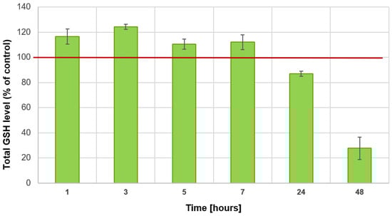 To investigate the direct effect of DMSO on the GSH level, an additional in vitro test was performed. From the results, it was found that the incubation of GSH in pure water at room temperature for 48 h did not result in significant changes in the amount of thiol groups—the GSH concentration was stable throughout the analysis, at 153.7 ± 5.7 nM. The results obtained for the second group, in which GSH was incubated with a 10% aqueous solution of DMSO (under the same conditions), revealed that initially (hours 1–7), the amount of available thiol groups increases—the greatest increase, of approx. 25%, was observed after 3 h (Figure 3). However, a progressive decrease in the number of thiol groups is already observed after one day. After 24 h, the number of thiol groups was approximately 13% lower, and after 48 h, by as much as 72% (Figure 3).