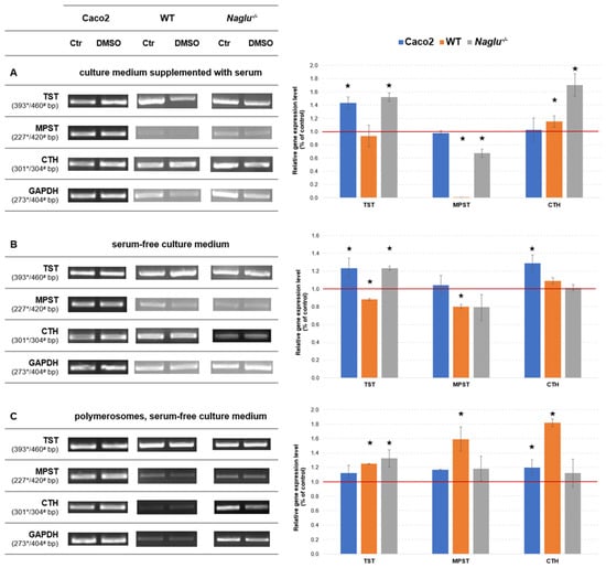 As shown in Figure 4, DMSO altered the expression levels of the sulfurtransferase genes studied, and the direction of these changes is similar in the vast majority of cases. Twenty-four hours after DMSO was added to the serum-containing medium, there was an increase in the expression level of the gene encoding TST in the Caco-2 (by 40%) and Naglu−/− (by 50%) cells, and the gene encoding CTH in the WT (by 20%) and Naglu−/− (by 70%) cells (Figure 4A) compared to the corresponding control groups. As for the gene encoding MPST, under these experimental conditions, a reduction in its expression level in the WT and Naglu−/− cells by almost 100% and by 30%, respectively, was observed (Figure 4A). Similar results were obtained for an equivalent experiment conducted in serum-free culture medium (Figure 4B). In this case, we also observed an increase in the TST gene expression level in the Caco-2 and Naglu−/− cells (by 20% in the both cases), as well as a 30% increase in the CTH gene expression level in the Caco-2 cell line compared to their control groups (Figure 4B). Moreover, twenty-four hours after the direct introduction of DMSO into the serum-free culture medium, a decrease in the expression level of the gene encoding MPST and TST, by 20% and 10%, respectively, was also observed in the WT cell line (Figure 4B). An interesting observation was noted when DMSO-loaded polymerosomes were introduced into the serum-free culture medium (Figure 4C). After changing the method of delivery of the compound to the cells, as in previous cases, a statistically significant increase in the expression level of the gene encoding TST in Naglu−/− cells (by 30%) and the gene encoding CTH in the Caco-2 and WT cells, by 20% and 80%, respectively, were observed (Figure 4C). In this case, contrary to the results from the two previous experiments (Figure 4A,B), there was also an increase in expression levels for the gene encoding MPST and TST by 60% and 20%, respectively, in the WT cells (Figure 4C). In all other cases, the expression of the examined genes encoding the appropriate sulfurtransferases remained at the control levels (Figure 4A–C).
