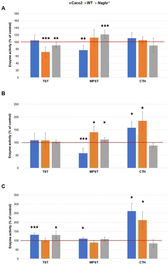 Effect of DMSO administration (A) to the culture medium supplemented with serum and (B) into the serum-free culture medium on sulfurtransferases activity. (C) Effect of administering DMSO-loaded polymerosomes into the serum-free culture medium on sulfurtransferases activity. The control values of TST, MPST, and CTH activities, determined after 24 h of culture of the Caco-2 cells, equaled, respectively, 92.5 ± 14.1; 508.1 ± 56.0; 2.6 ± 0.04 nmole/mg protein·min−1 (A); 35.0 ± 13.7; 413.2 ± 80.6; 4.4 ± 1.7 nmole/mg protein·min−1 (B); and 38.1 ± 3.2; 454.3 ± 35.3; 1.4 ± 0.7 nmole/mg protein·min−1 (C). In the WT cells, the control values of TST, MPST, and CTH activities are equaled, respectively, 34.0 ± 1.2; 215.9 ± 27.7; 1.4 ± 0.1 nmole/mg protein·min−1 (A); 24.7 ± 6.1; 39.5 ± 5.2; 0.9 ± 0.2 nmole/mg protein·min−1 (B); and 15.5 ± 1.9; 127.4 ± 13.3; 1.1 ± 0.01 nmole/mg protein·min−1 (C). In the Naglu−/− cells, the control values of TST, MPST, and CTH activities are equaled, respectively, 17.2 ± 1.1; 170.6 ± 11.2; 2.0 ± 0.01; nmole/mg protein·min−1 (A); 12.3 ± 1.0; 110.7 ± 11.6; 1.1 ± 0.2 nmole/mg protein·min−1 (B); and 9.3 ± 1.6; 94.6 ± 8.7; 1.9 ± 0.3 nmole/mg protein·min−1 (C). The results are presented as arithmetic mean ± standard error of the mean (SEM) from three independent experiments. Statistical significance was set as follows: * p < 0.05; ** p < 0.01 and *** p < 0.001 (Student’s t test).