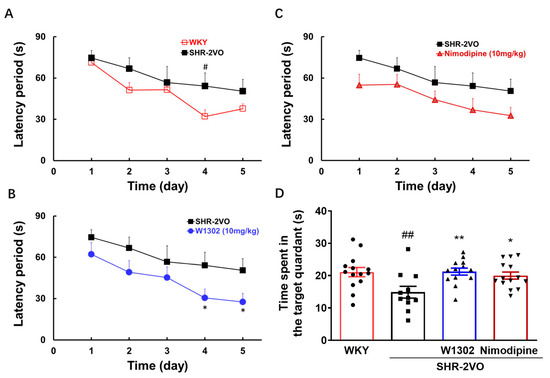 The effect of W1302 on the performance of SHR-2VO rats in the Morris water maze test. SHR-2VO rats: permanent occlusion of bilateral common carotid arteries in spontaneously hypertensive rats; WKY rats: age-matched Wistar Kyoto rats as non-hypertensive sham-operation control. (A–C) Escape latency for rats to locate the hidden platform in the test during five consecutive days. (D) The time of rats spent in the quadrant where the platform was once placed within 90 s. Data were expressed as mean ± S.E.M. (n = 11–14). # p < 0.05, ## p < 0.01 vs. WKY rats and * p < 0.05, ** p < 0.01, vs. SHR-2VO rats.