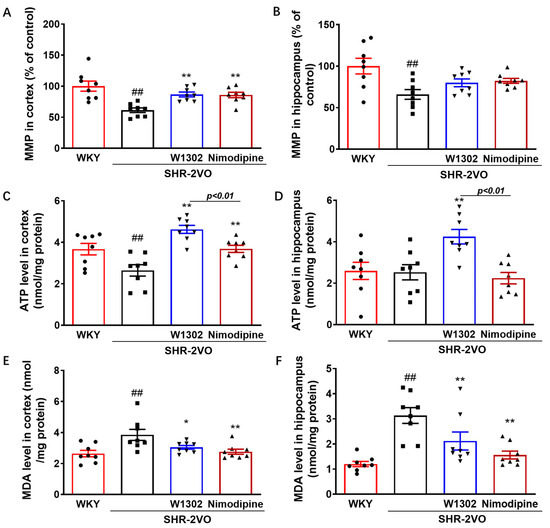 Chronic hypertension and cerebral hypoperfusion could alter cerebral blood flow and microvascular pressure, thus damaging mitochondria and increasing oxidative stress [2,22]. As illustrated in Figure 2, SHR-2VO rats showed markedly decreased mitochondrial membrane potential (MMP) (39% in cortex, p < 0.01; 34% in hippocampus, p < 0.01), ATP production (28% in cortex, p < 0.05), and increased MDA levels (46% in cortex, p < 0.05; 160% in hippocampus, p < 0.01), compared to WKY rats. W1302 or nimodipine treatment attenuated mitochondrial dysfunction and oxidative stress in SHR-2VO rats, as indicated by enhanced MMP (41% for W1302 in cortex, p < 0.01; 40% for nimodipine in cortex, p < 0.01) (Figure 2A), ATP production (75% or 68% for W1302 in cortex or hippocampus, p < 0.01; 39% for nimodipine in cortex, p < 0.01) (Figure 2C,D), and decreased MDA levels (21% or 32% for W1302 in cortex or hippocampus, p < 0.05; 28% or 50% for nimodipine in cortex or hippocampus, p < 0.01) (Figure 2E,F). Compared with nimodipine treatment, W1302 intervention significantly increased ATP production (p < 0.01) and improved the energy supply in the brain of SHR-2VO rats (Figure 2C,D).