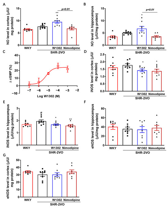 The effects of W1302 on NO production and activities of eNOS or iNOS in SHR-2VO rats. SHR-2VO rats: permanent occlusion of bilateral common carotid arteries in spontaneously hypertensive rats; WKY rats: age-matched Wistar Kyoto rats as non-hypertensive sham-operated control. (A,B) The nitric oxide assay kit for detecting the production of NO (n = 8). (C) EC50 value of cGMP production in SKN cells after 4 h of incubation with W1302 (n = 4). (D–G) eNOS and iNOS were analyzed by Elisa kits (n = 8). Data were expressed as mean ± S.E.M. # p < 0.05 vs. WKY rats and * p < 0.05, ** p < 0.01, vs. SHR-2VO rats.