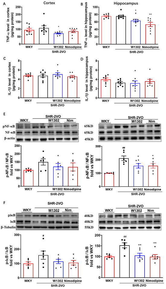 On the other hand, increasing evidence suggests that NO plays a key role in protecting blood vessels from inflammation [23,24,25]. In our study, the pro-inflammatory cytokines levels of TNF-α and IL-1β showed no obvious differences in the SHR-2VO rats (Figure 4A–D), whereas the expressions of pNF-κB and pIκBα were significantly increased in the brains of SHR-2VO rats compared with those of WKY rats (Figure 4E,F). The administration of W1302 rescued hypoperfused-induced injury in SHR-2VO rats, as indicated by lower pIκBα/IκBα and pNF-κB/NF-κB expression by 31% (p < 0.01) and 27% (p < 0.05) in the hippocampus, respectively (Figure 4E,F), as well as decreased TNF-α levels by 20% (p < 0.05) in the cortex and 19% (p < 0.05) in the hippocampus, respectively (Figure 4A,B). The nimodipine treatment group showed a similar effect to W1302 intervention. The results suggested that W1302 might regulate NF-κB activation to inhibit inflammation such as TNF-α.