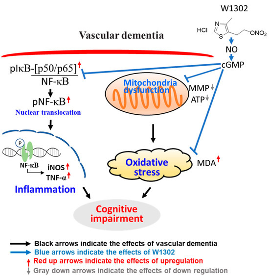 A schematic illustration of W1302 alleviating learning impairments induced by hypoperfusion with hypertension through the NO-regulated NF-κB signaling pathway and mitochondrial function preservation. In this schematic diagram, SHR-2VO rats, a VaD model associated with spontaneous hypertension, significantly increase pIκB, pNF-κB, iNOS and TNF-α levels, which further damage mitochondrial function and increases oxidative stress. W1302 activated NO/cGMP and further inhibited the NF-κB signaling pathway, decreasing inflammatory factors such as TNF-α and iNOS levels, and protecting cells from mitochondria damage.