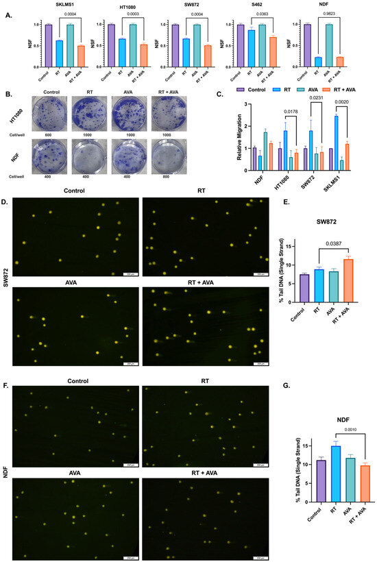 AVA selectively sensitizes STS cells to radiation therapy and protects normal cells against DNA damage in vitro. (A). Clonogenic survival in SKLMS1 leiomyosarcoma cells, HT1080 fibrosarcoma cells, SW872 liposarcoma cells, S462 MPNST, and NDFs. Data shows untreated controls, cells treated with RT (2 Gy), AVA, or RT + AVA (5 µM). (B). Representative images of clonogenic cell survival following treatment with RT + AVA between HT1080 (top) and NDFs (bottom). (C). Relative migration of NDFs, HT1080 fibrosarcoma, SW872 liposarcoma, and SKLMS1 leiomyosarcoma cells following treatment. (D). Representative images of alkaline comets in SW872 following treatment (2 Gy RT, 5 µM AVA). (E). Percent tail DNA (single strand) in SW872 cells following treatment. (F). Representative images of alkaline comets in NDFs following treatment (2 Gy RT, 5 µM AVA) (G). Percent tail DNA (single strand) in NDFs following treatment. N = 3 for each experiment. Error bars represent standard error of the mean (SEM).