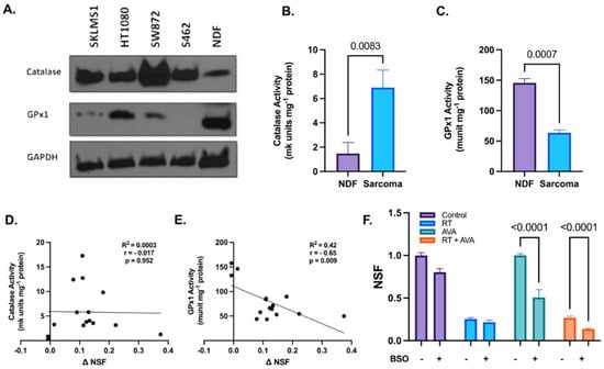 Alterations in hydrogen peroxide metabolism may potentiate the selective toxicity of AVA in STSs. (A). Immunoblotting of CAT and GPx1 in various STS cell lines and NDFs, GAPDH was used as a loading control (n = 1). (B). CAT activity (mk units mg−1 protein) in NDF and STS cells (SKLMS1, HT1080, SW872, and S462). (C). GPx1 activity (munit mg−1 protein) in NDF and sarcoma cells (SKLMS1, HT1080, SW872, and S462). (D). Correlation between catalase activity (mk units mg−1 protein) and ΔNSF (ΔNSF = NSFRT − NSFRT+AVA) in STSs and NDFs. (E). Correlation between GPx1 activity (munits mg−1 protein) and ΔNSF in STSs and NDFs. (F). Clonogenic survival of NDFs treated with RT + AVA with and without BSO-induced glutathione depletion. N = 3. Error bars represent standard error of the mean (SEM).