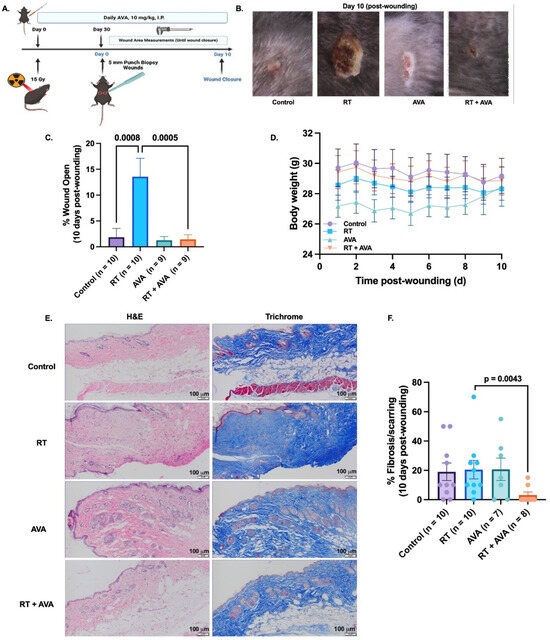 AVA accelerates RT-induced wound healing in a murine model. (A). Schematic of experimental design and mouse model of RT-induced wound healing impairment. (B). Representative images of wounds 10 days post wounding. (C). Percent wound closure on day 10 post wounding. (D). Body weights (gms) over time (days) during the 10-day wound monitoring period. (E). Representative HE (top) and trichrome (bottom) images of mouse skin from untreated mice and mice treated with RT, AVA, and RT + AVA, 10 days post wounding 100X magnification, scale = 20 µm. (F). Quantification of percent fibrosis (HE) in mouse skin harvested 10 days post wounding. p ≤ 0.05 is statistically significant. Error bars represent standard error of the mean (SEM).