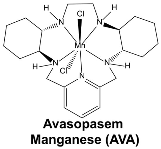 One of the earliest dismutase mimetics was synthesized and characterized in the early 1990s [31]. In the ensuing decades, dismutase mimetics have been shown to protect against radiation damage in skin, soft tissue, GI mucosa, liver, brain, and lung tissues [32,33,34,35]. Avasopasem manganese (AVA or GC4419) (Scheme 1) has resulted in an enhanced bioavailability and a higher specificity to O2•− relative to other SOD mimetics; furthermore, its catalytic rate constant of 2 × 107 M−1 s−1 adequately mimics the native enzyme [35].