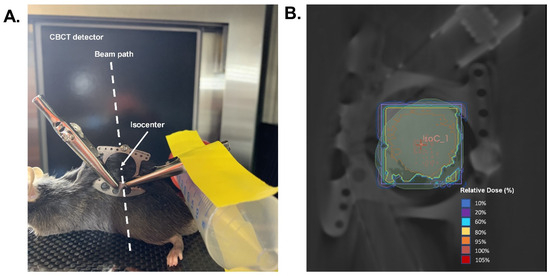 Would healing radiation treatment design. (A). Demonstration of radiation delivery set-up and animal positioning. (B). Representative radiation dose distribution. Isodose curves were generated based on a cone-beam CT image with the central field contoured and an isocenter placed in the middle of the wound field as shown in A. Mice were given a prescribed dose of 15 Gy delivered in two parallel opposed beams (90°/270°) with 50% beam weighting.
